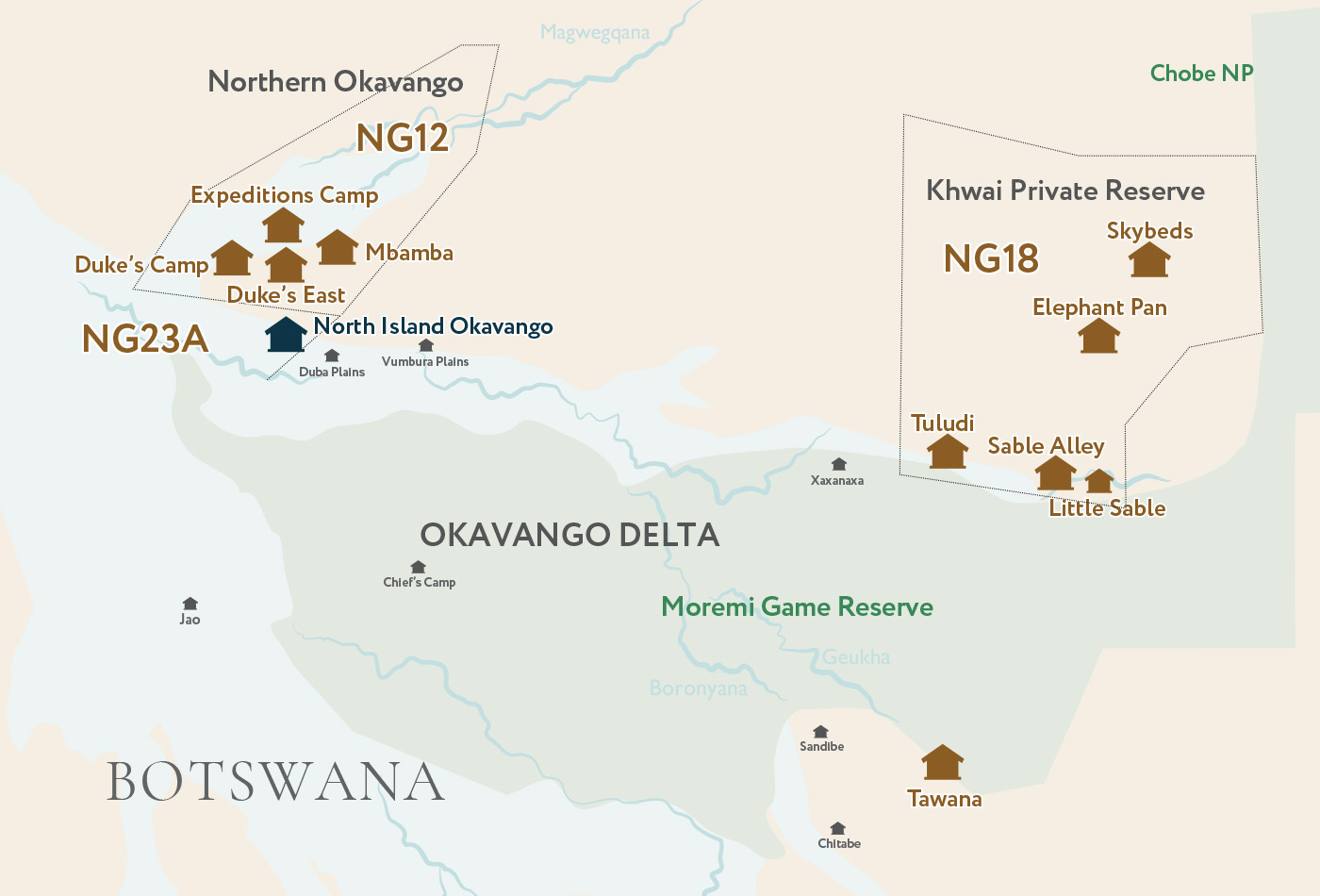 Designed around comfort and luxury it won’t take you long to settle right in. Here you’ll be blissfully unaware of anything else other than the tranquility and beauty of your surroundings. This is also an exciting opportunity to experience the joy of the Okavango Delta done three ways. On land, on water and in the air. Each new adventure as extraordinary as the last. The wildlife opportunities in and around camp are exceptional and discovering this idyllic island landscape for yourself will not only delight, but also leave you full to the brim with stories to share.