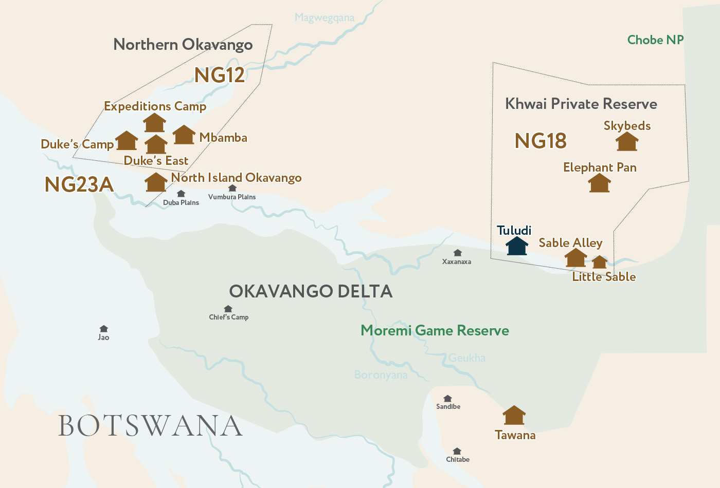 Located in the Khwai Private Reserve, in the secluded, northern reaches of the Delta, this magical 200,000-hectare reserve is astonishing in its diversity. Think vast, flowing floodplains that stretch out like the prettiest of emerald-green carpets; pockets of verdant forests and battalions of enormous Leadwood trees; pockets of lily-covered lagoons and meandering waterways. And in the middle of it all is the fast-flowing Khwai River, the lifeline of the reserve and one that attracts herds of wildlife in their droves. The reserve is bordered by the world-famous Moremi Game Reserve to the south, and the vast Chobe National Park to the east. Together the three reserves are part of the greater Okavango Delta World Heritage Site.
