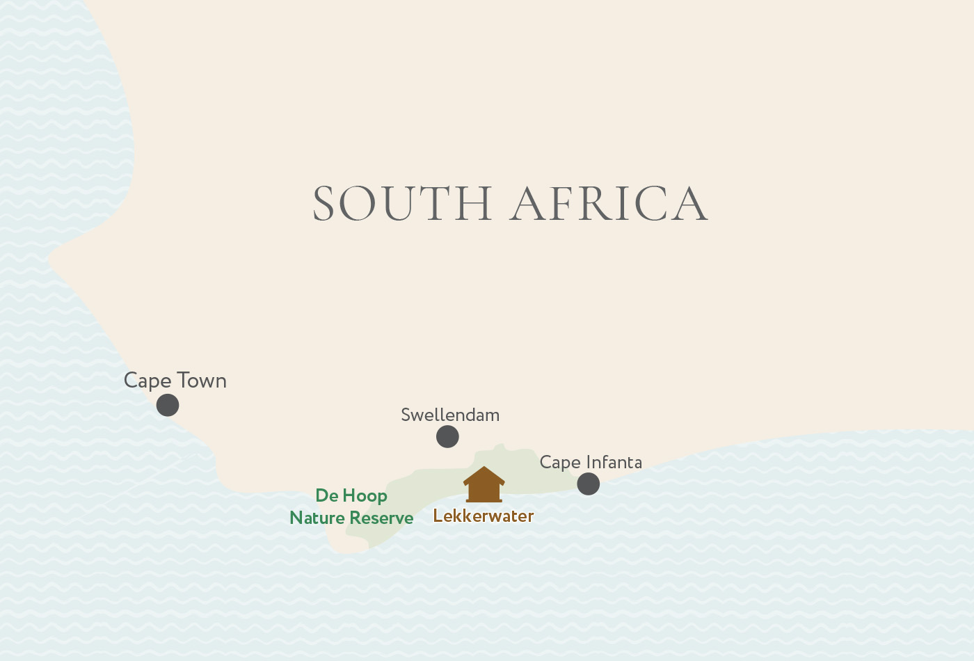 De Hoop lies three hours drive from Cape Town in the Overberg region, near Cape Agulhas, the southern tip of Africa. It is a convenient destination for travellers exploring South Africa’s Garden Route.
